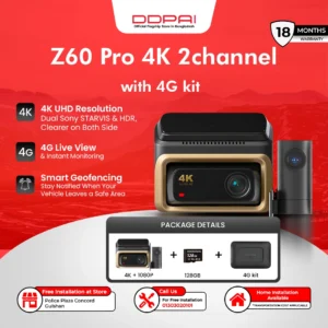 DDPAI Dash Camera 4G Z60 Pro 4K 2 Channel Front & Back WIth 4G Parking kit 32GB Built-in Memory With 128Gb -18 Months Warranty