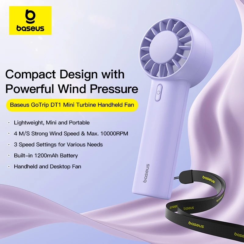 Stay cool and comfortable on the go with the Baseus Fan GoTrip DT1 Mini Turbine Handheld Fan in a stylish Nebula Purple color. This compact, portable fan is designed to provide a refreshing breeze wherever you are, whether you’re traveling, commuting, or simply relaxing outdoors. Its unique turbine fan technology ensures powerful airflow, making it an ideal companion for hot days.