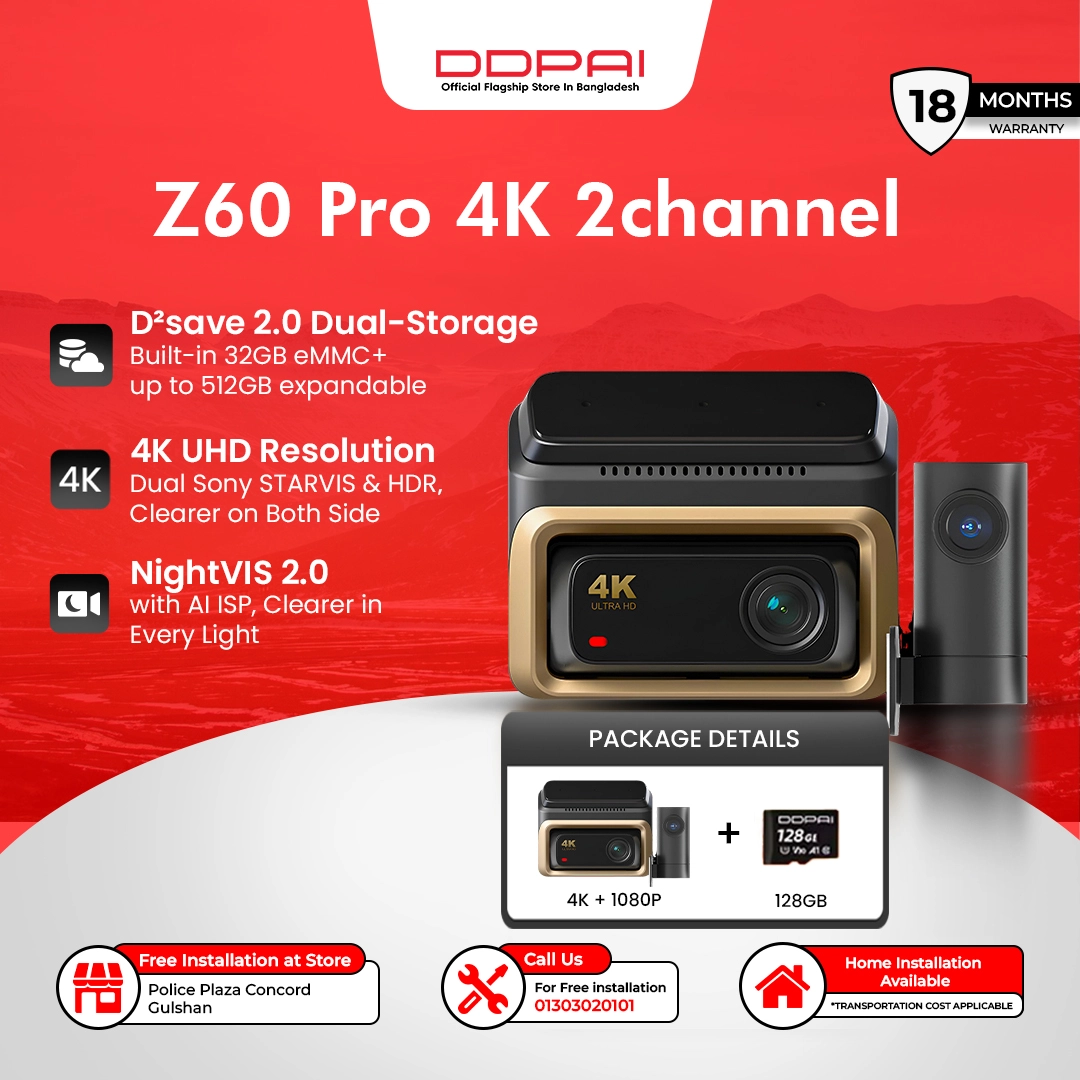 The latest price of DDPAI Dash Camera Z60 Pro 4K 2 Channel Front & Back Camera 32GB Built-in Memory & 128GB Memory -18 Months Warranty in Bangladesh is 23195৳. You can buy theDDPAI Dash Camera Z60 Pro 4K 2 Channel Front & Back Camera 32GB Built-in Memory & 128GB Memory -18 Months Warranty at best price from our website or visit any of our showrooms.