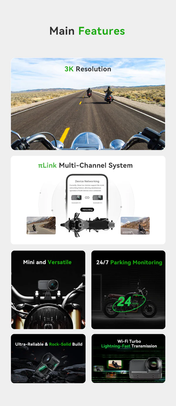 - πLink Multi-Channel System: Wirelessly connects two cameras for dual 3K HD recording, managed via the DDPAI app.
