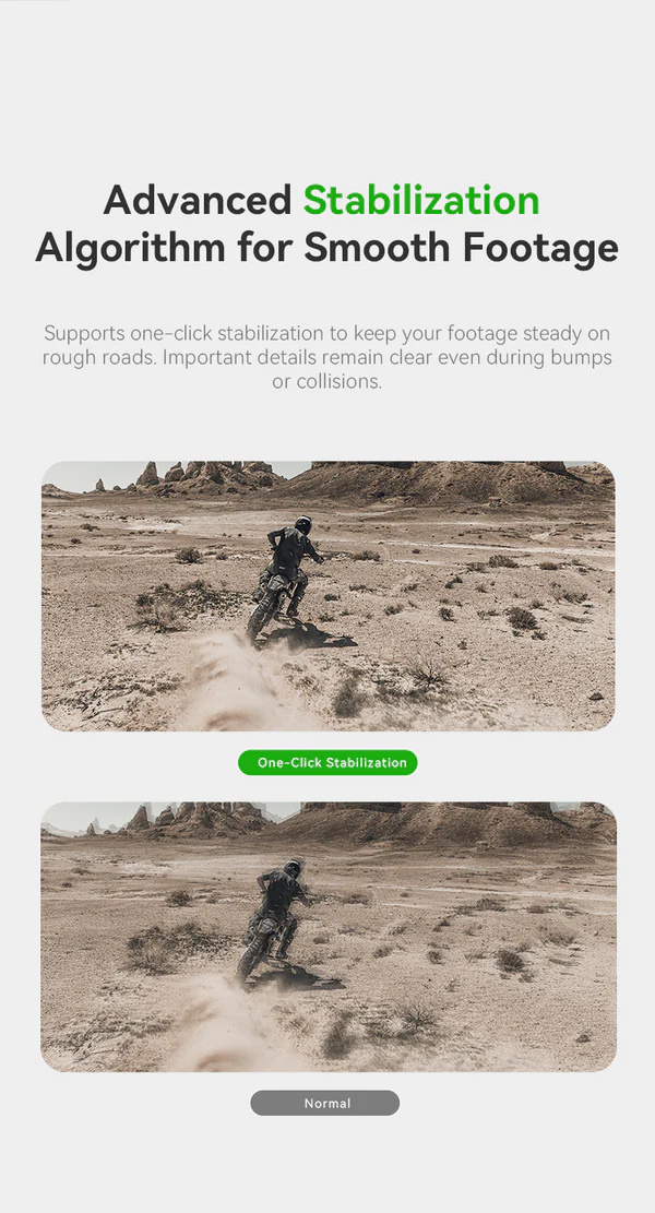 - Advanced Stabilization Algorithm: Keeps footage steady on rough roads with one-click stabilization.
