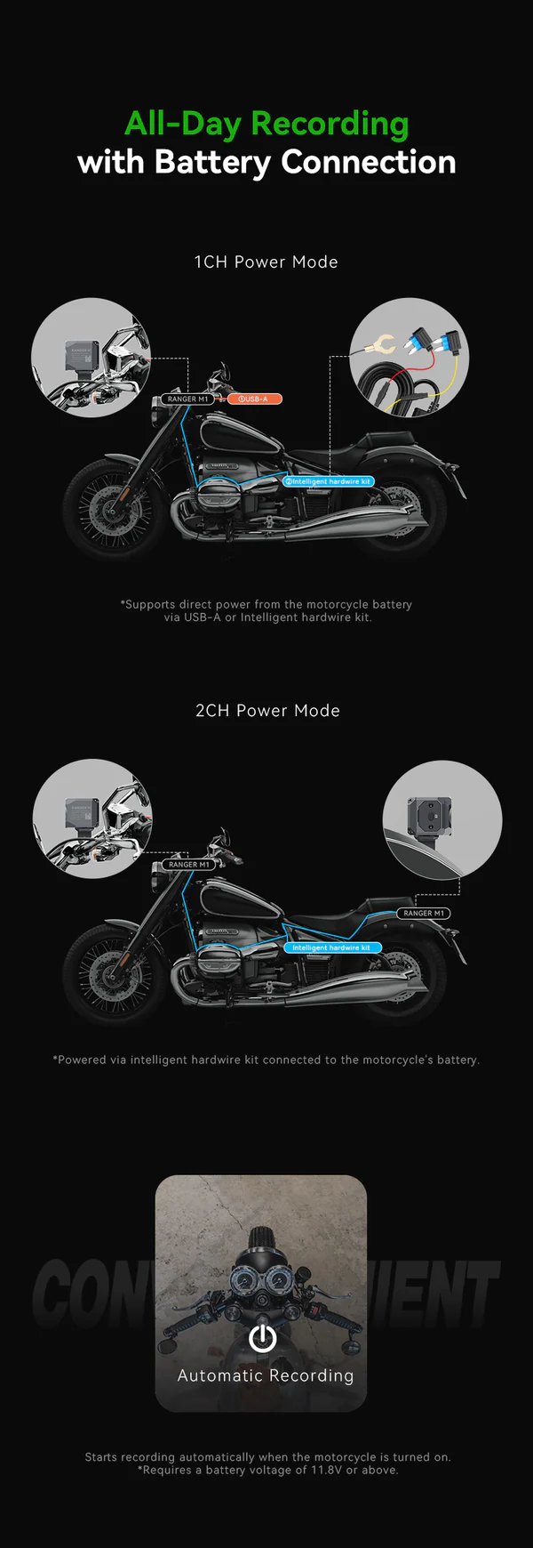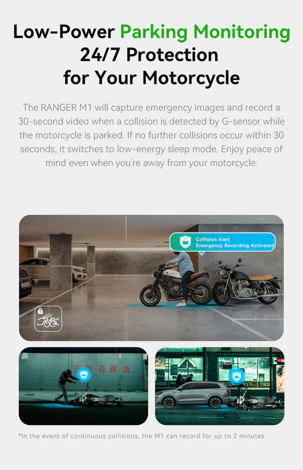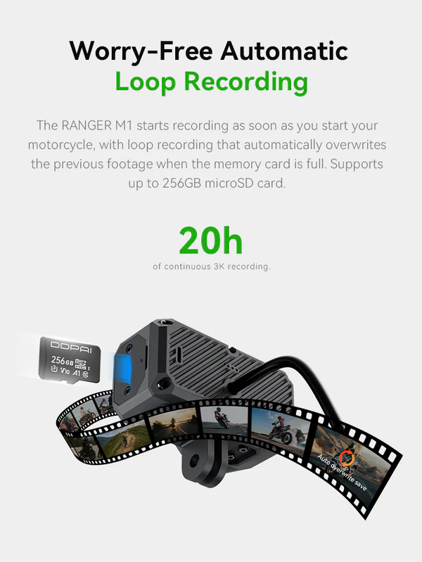 - All-Day Recording: Starts recording automatically when the motorcycle is turned on.