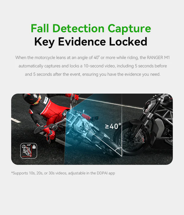 - Fall Detection: Automatically locks a 10-second video when the motorcycle leans at an angle of 40° or more.