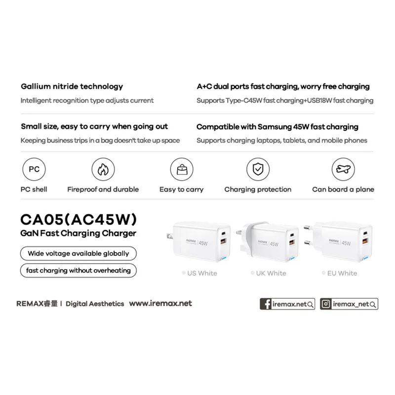 REMAX CA05 45W GaN Fast Charger USB-C USB-A Dual Port Power Adapter – UK Plug