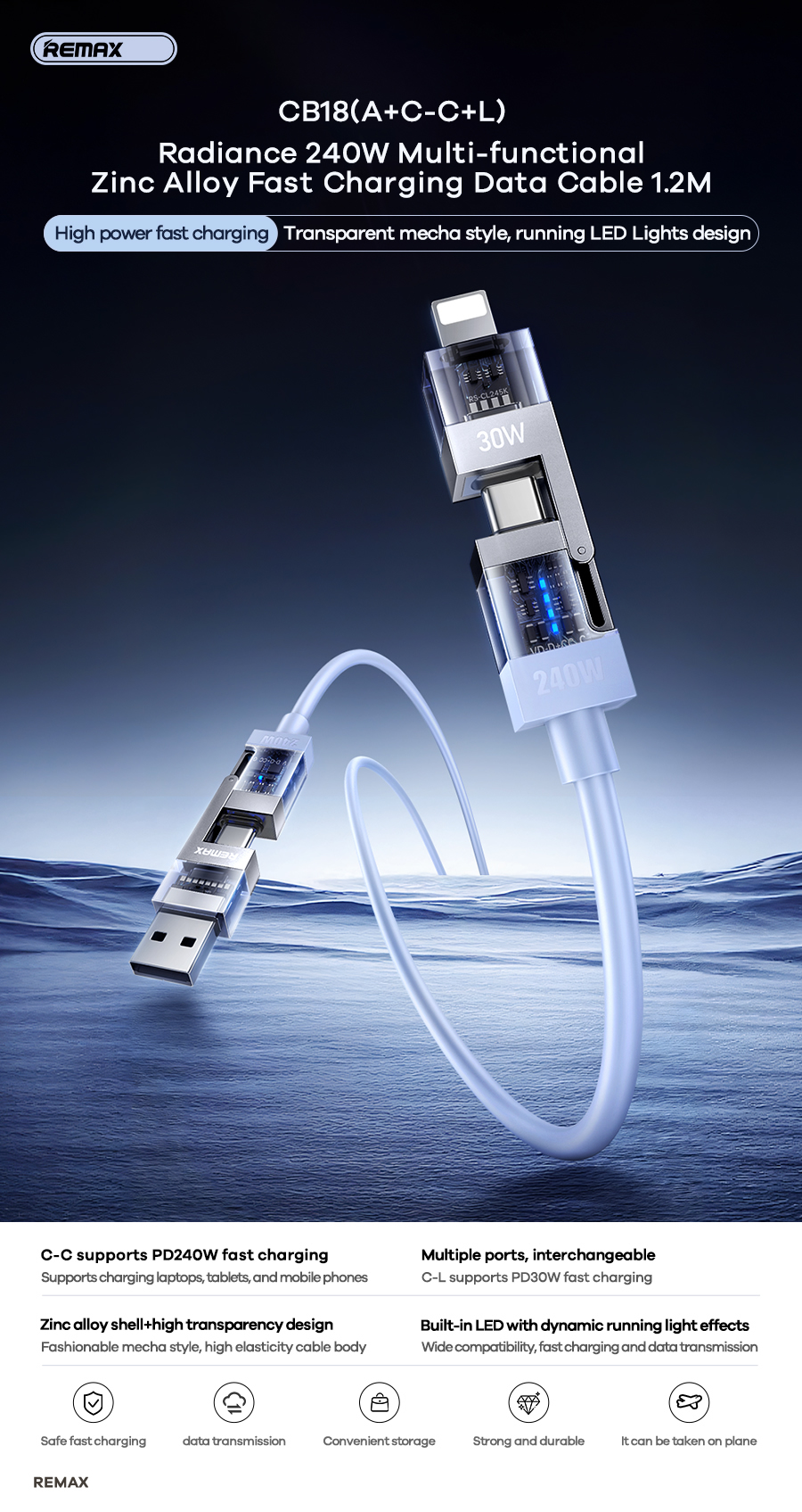 Remax CB18 versatile Multi Cable USB A To Type-C & Lightning & Type-c to Type-c & Lightning