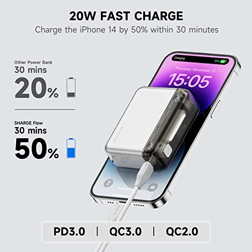 Equipped with a USB-C and USB-A port, the Sharge Flow supports multiple charging protocols, including PD 2.0/3.0 and SCP, allowing for fast and efficient charging. The USB-C input supports up to 12V⎓1.5A, ensuring rapid recharging of the power bank itself. On the output side, the power bank offers up to 20W output, making it capable of quickly charging devices like smartphones and tablets. You can charge two devices at once, thanks to its dual output ports.